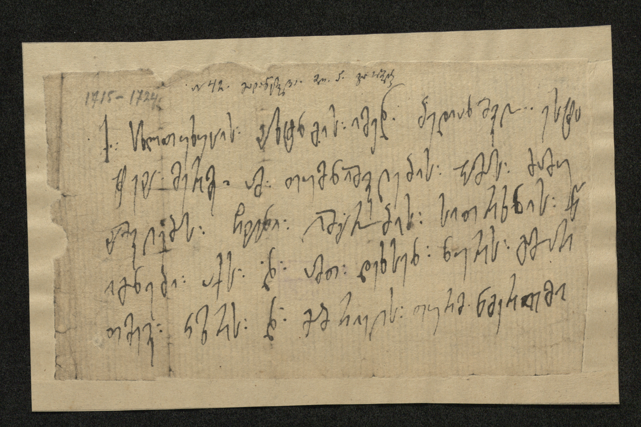 2. ახლავს მინაწერი შერულებული პოლიევქტოს კარბელაშვილის ხელით: “1715-1724 № 42. გადაწერილი მღ. პ. კარბელაშვილი”.