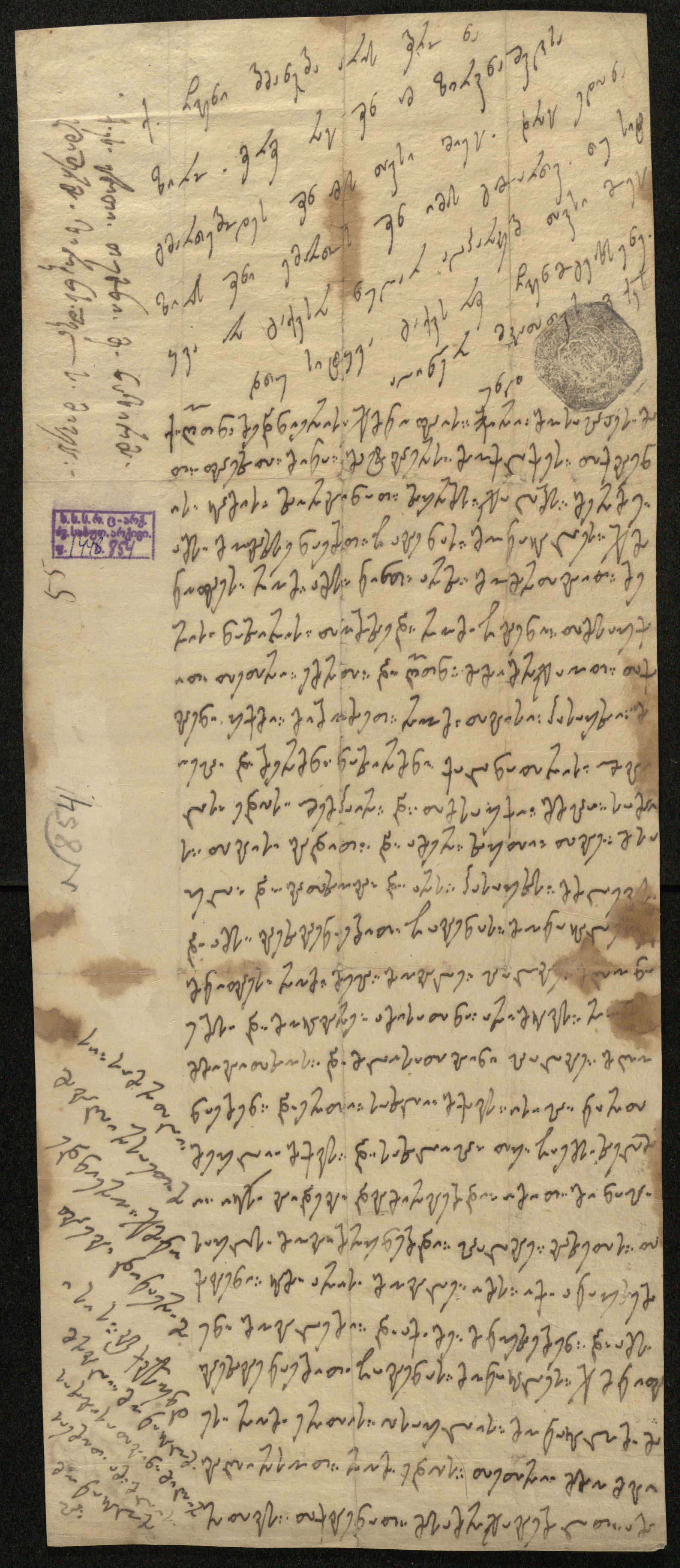 ქაღალდი მოყვითალო ყავისფერი ლაქებით, დაწერილი ყავისფერი მელნით