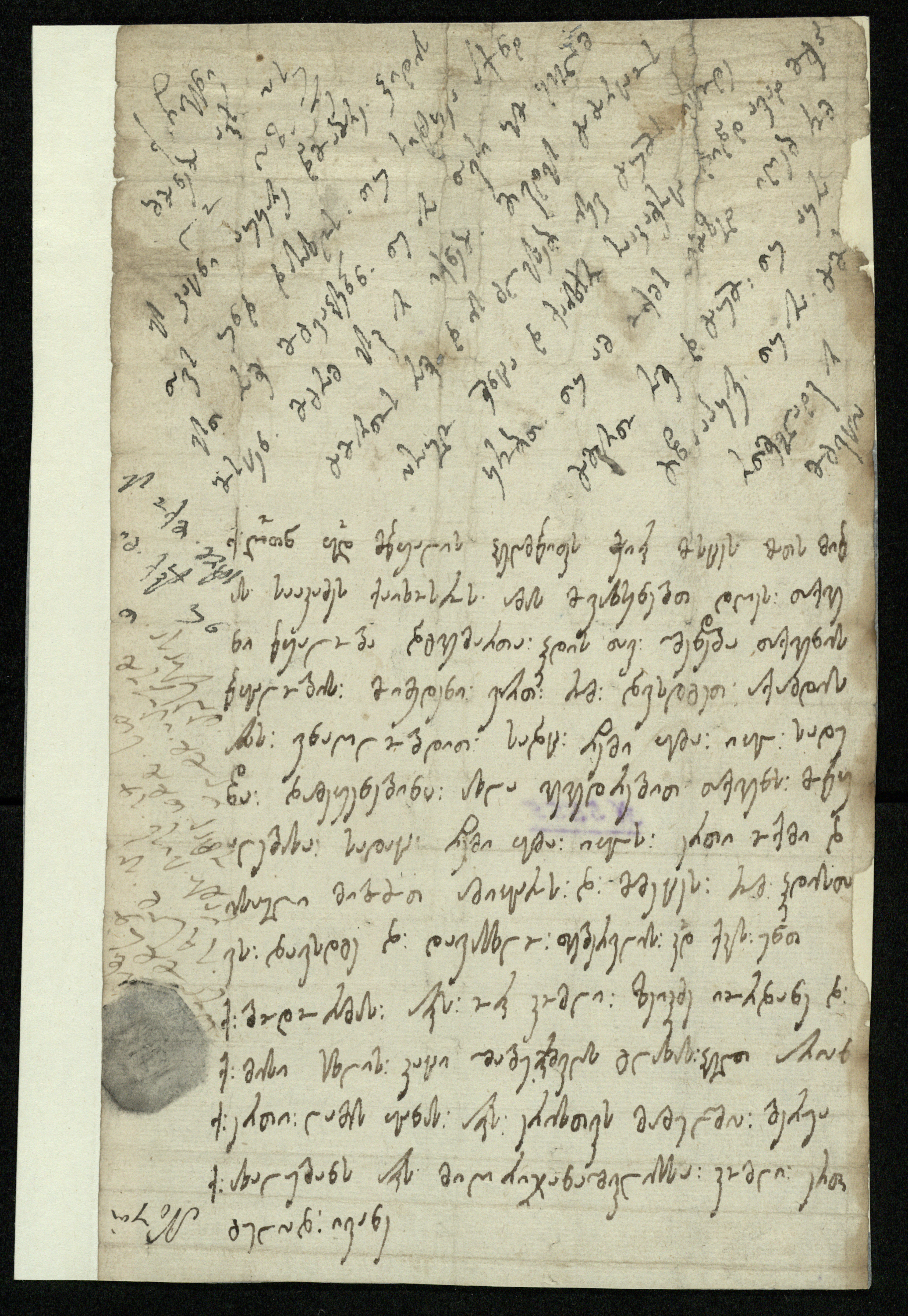 ქაღალდი ყვითელი ლაქებით, დაწერილი შავი და ყავისფერი მელნით