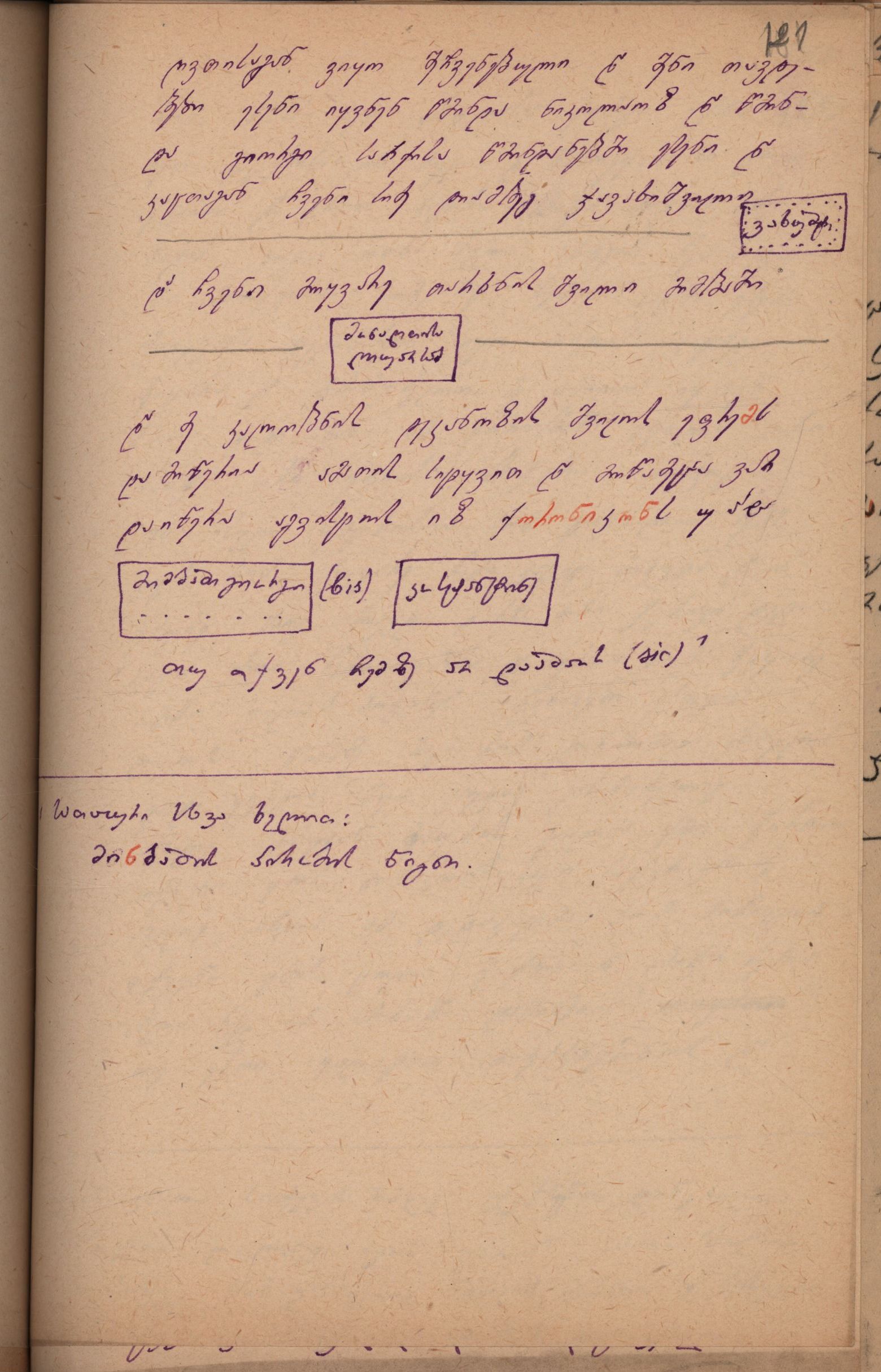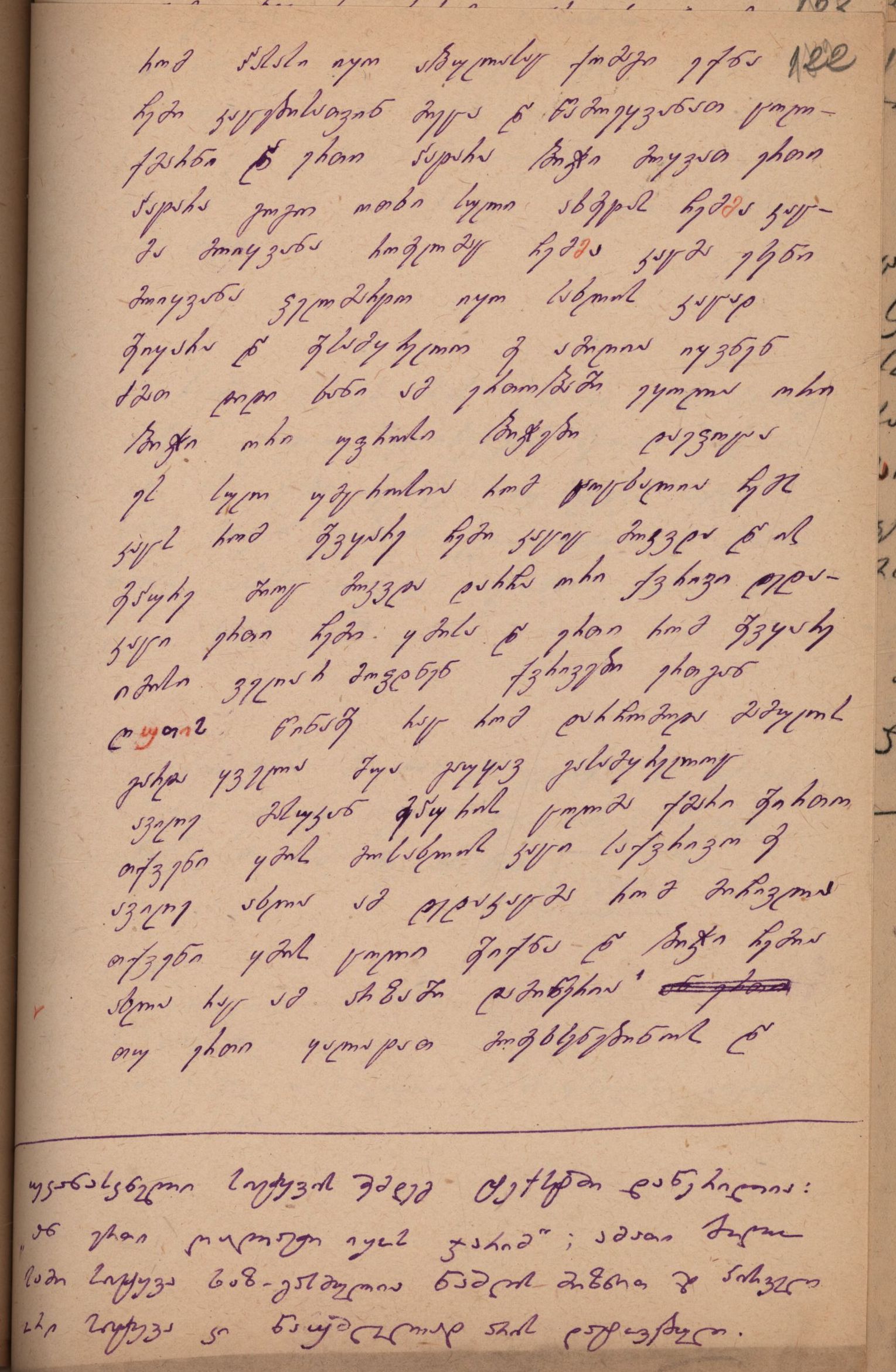 ქაღალდი ყვითელი, დაწერილი ლურჯი მელნით და წითელი ფანქრით.