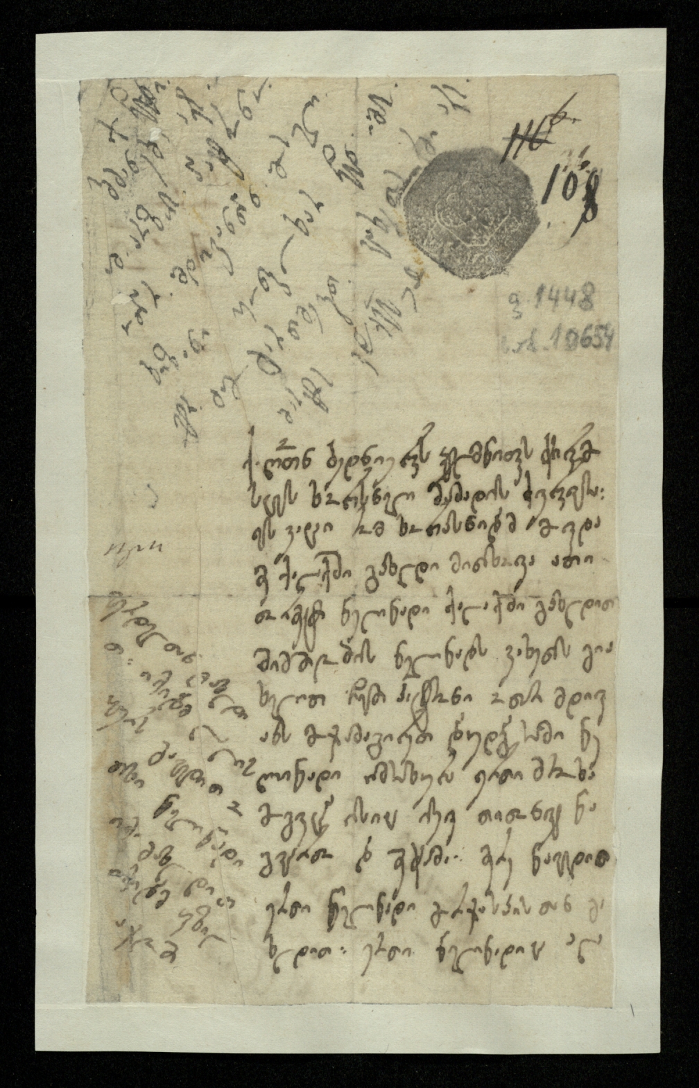 ქაღალდი ნაცრისფერი, დაწერილი ყავისფერი და შავი მელნით