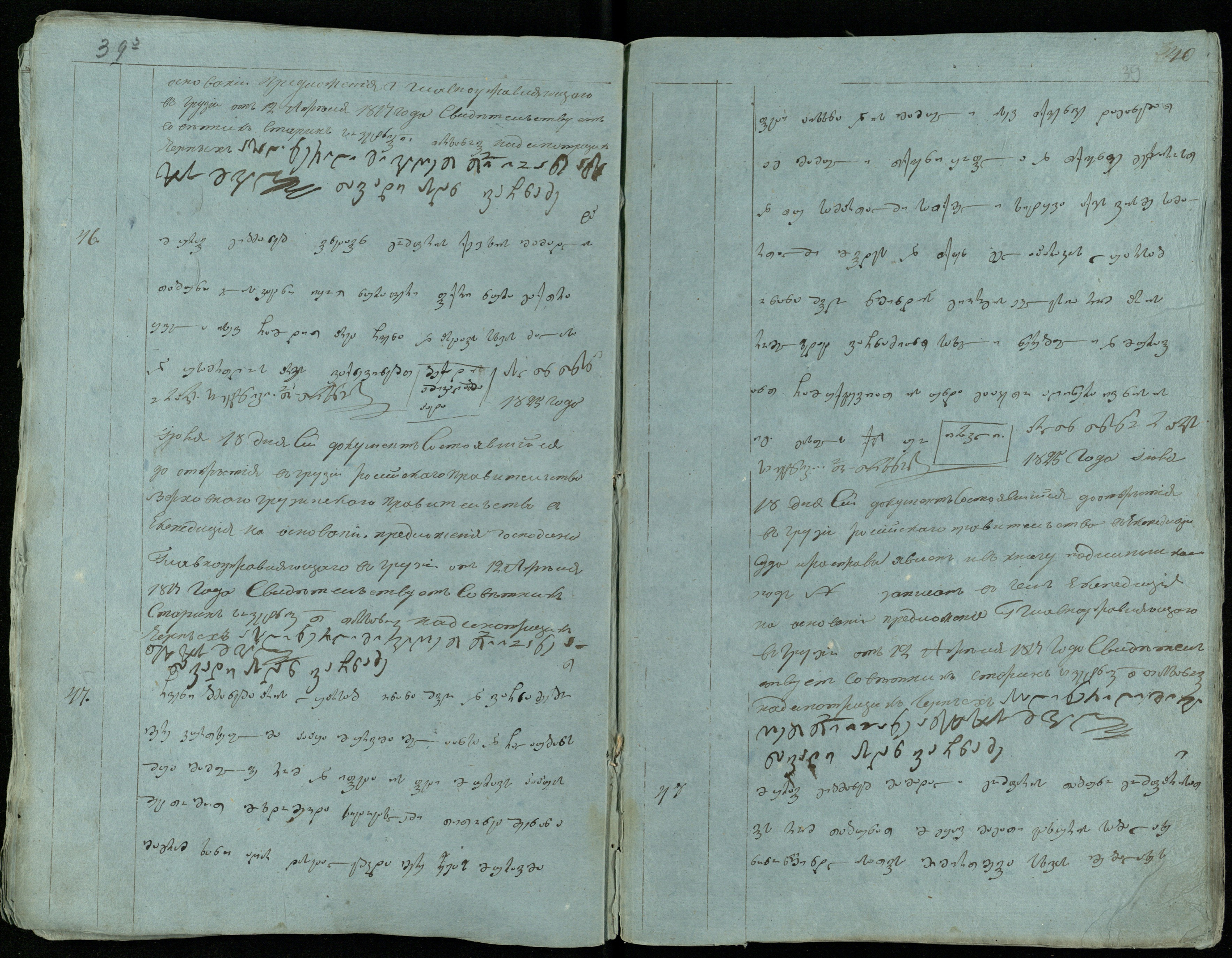 ქაღალდი ლურჯი, დაწერილი შავი მელნით.