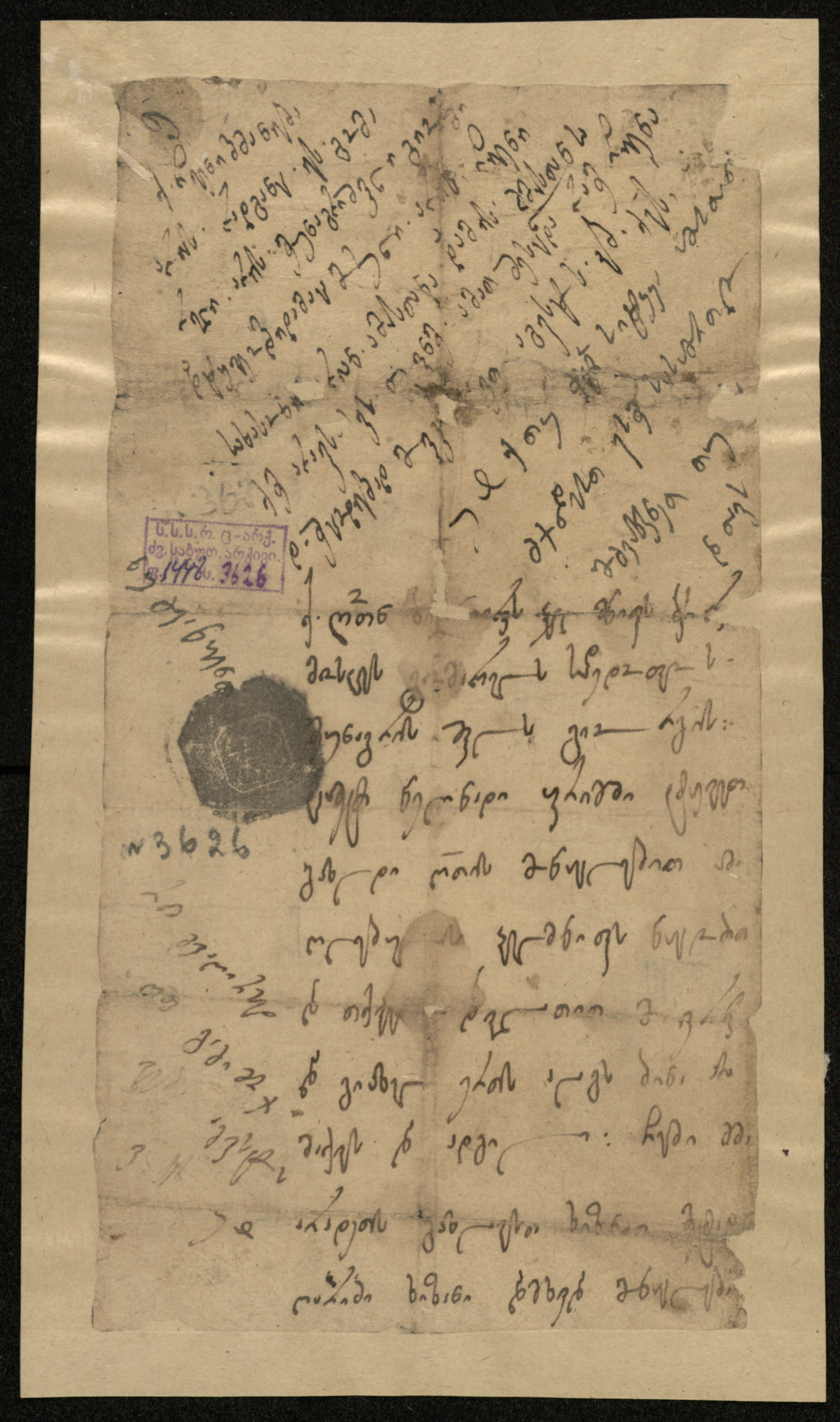 ქაღალდი ღია ყავისფერი, დაწერილი შავი და ყავისფერი მელნით.