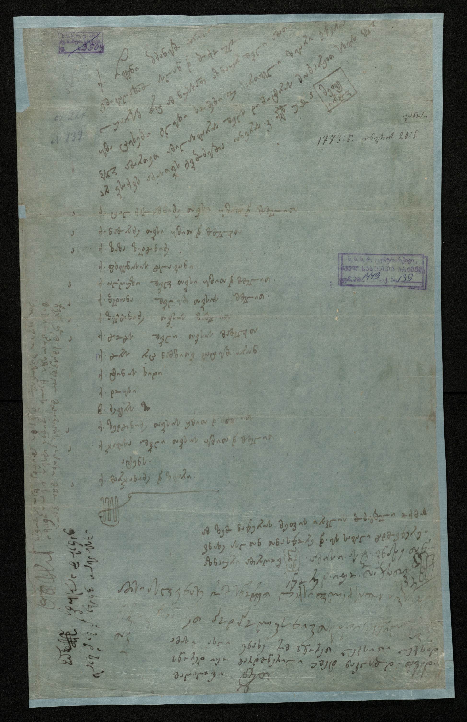 3. გვიანდელი მინაწერი პოლიევკტოს კარბელაშვილის ხელით ,,ვანოსი 1773 წ. იანვრის 20-ს“.