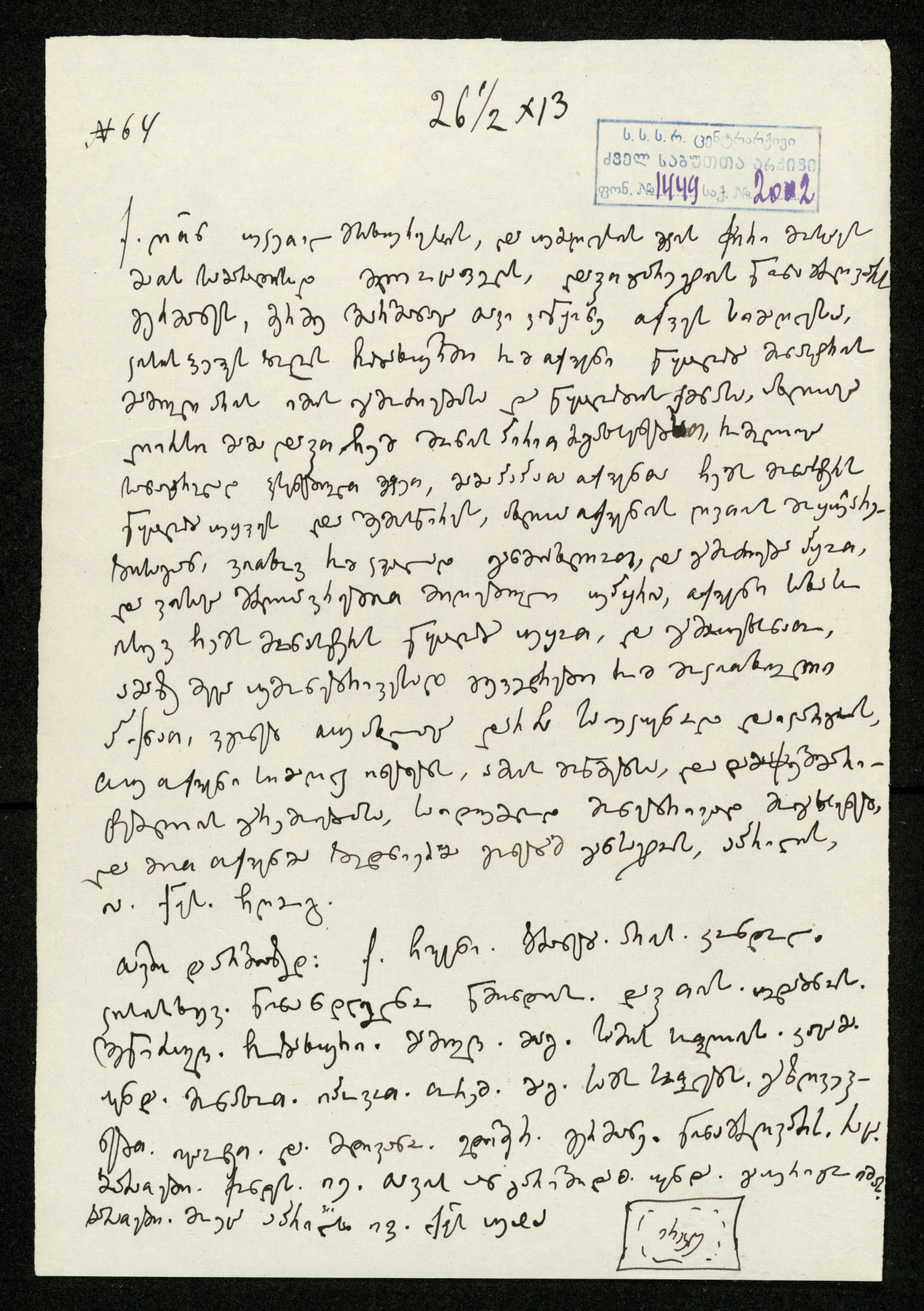 2. დედნის აღწერა სარგის კაკაბაძის მიერ: ,,დედნის ზომა: 261/2X13; ძველი საარქივო-სააღრიცხვო ნომერი: N64, განკვეთილობის ნიშანი წერტილი", პირი, ხეც, Ad-2057.