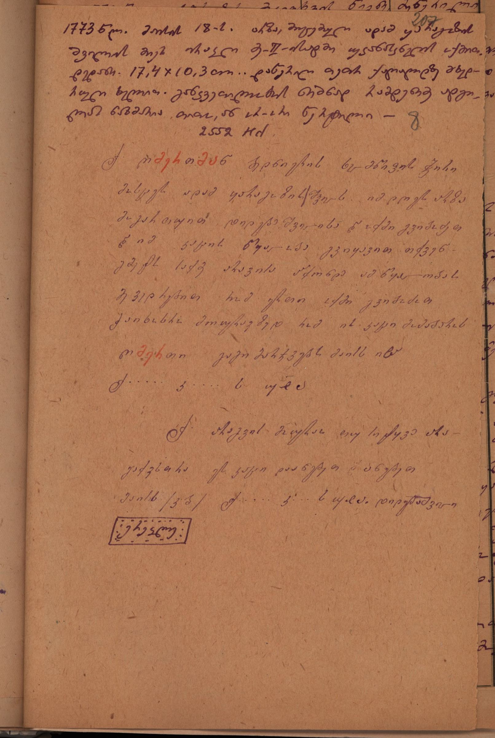 2. დედნის აღწერა გიორგი ბოჭორიძის მიერ: ,,დედანი, 17,4x10,3 cm.. დაწერილი თეთრ ქაღალდზე მხედრული ხელით, განკვეთიკობის ნიშნად რამდენიმე ადგილას ნახმარია თითი, ან ორ-ორი წერტილი", დედანი, ხეც, 2552Hd.