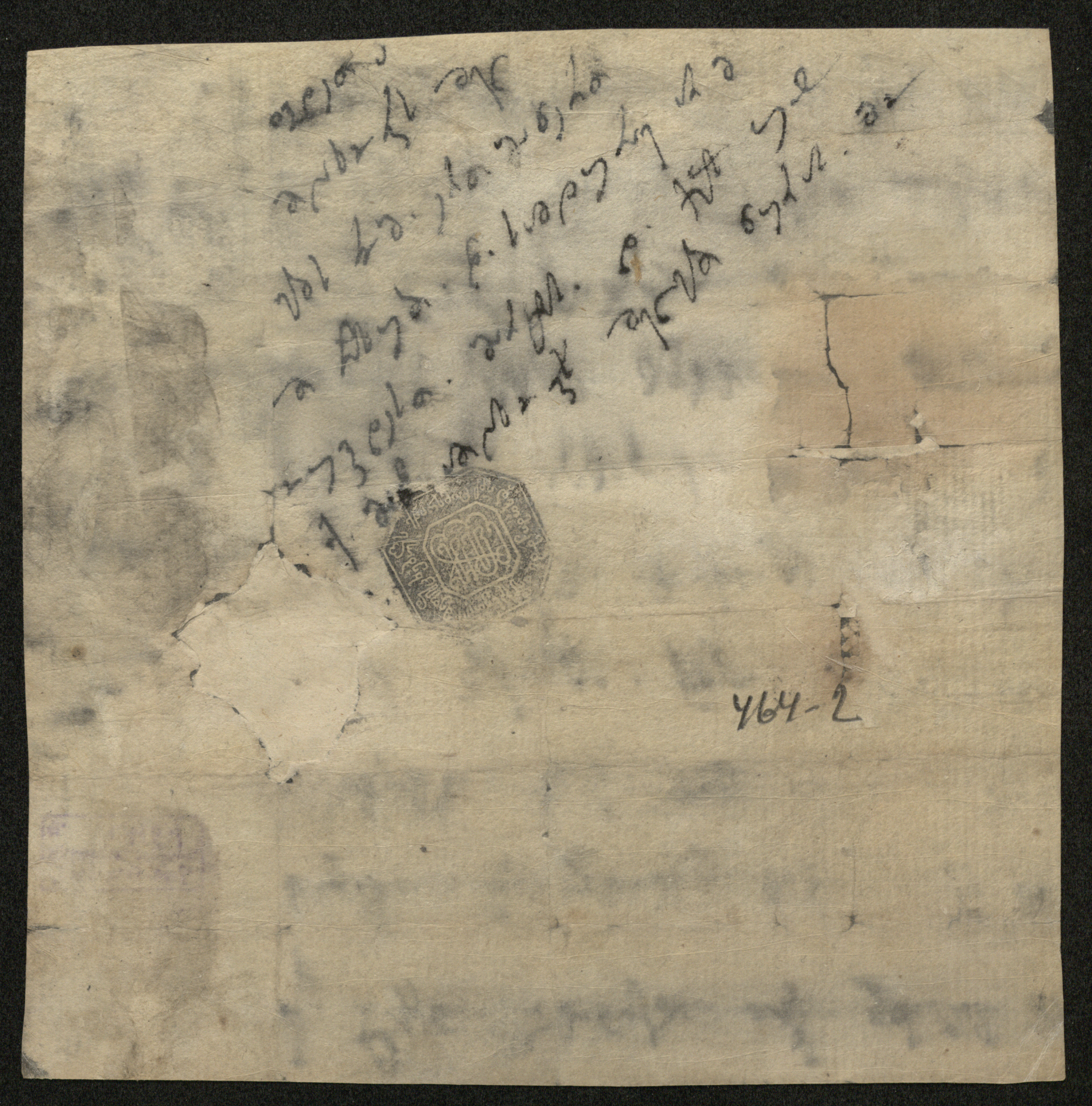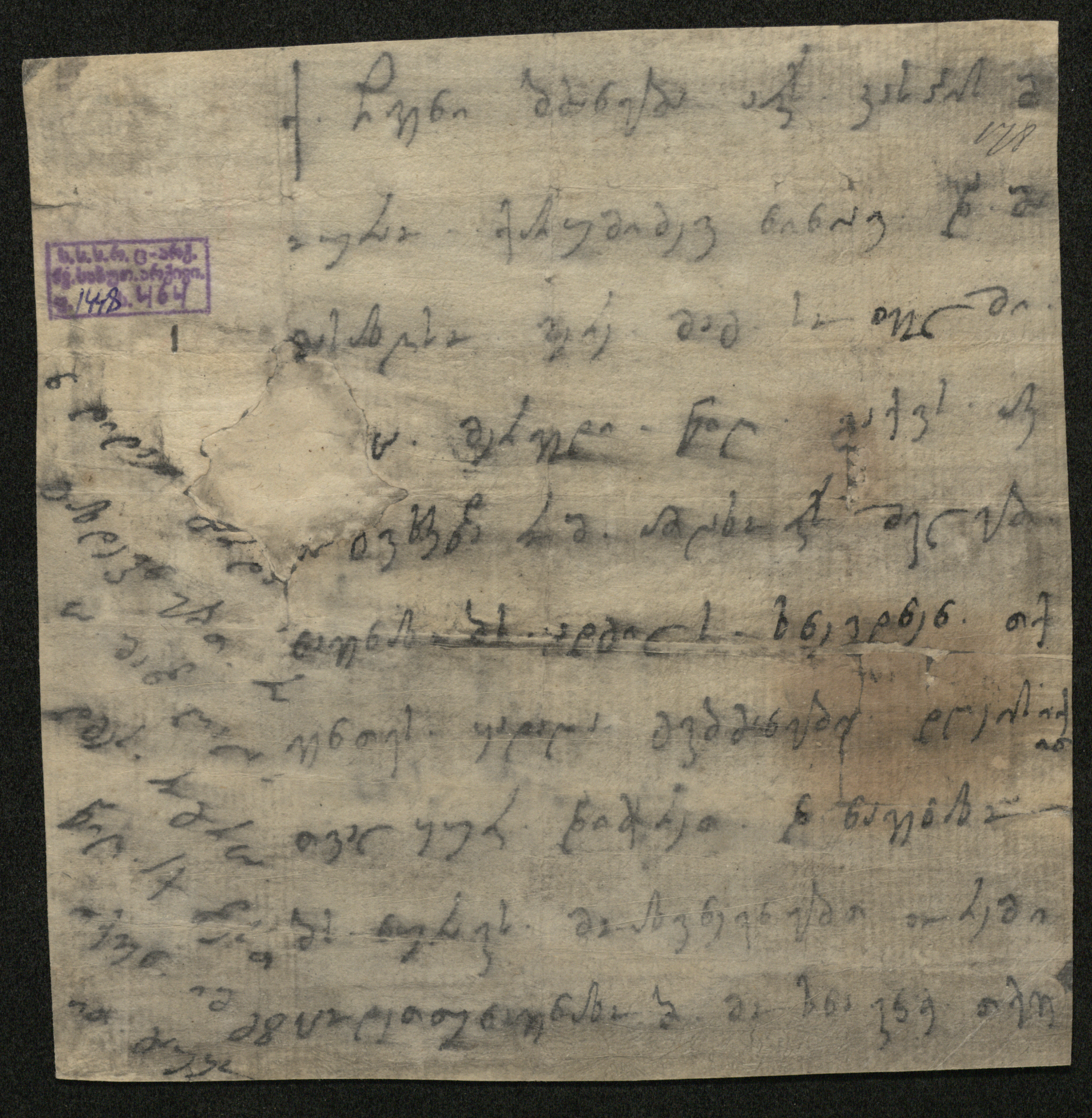 ქაღალდი ნაცრისფერი მუქი ლაქებით, დაწერილი შავი მელნით