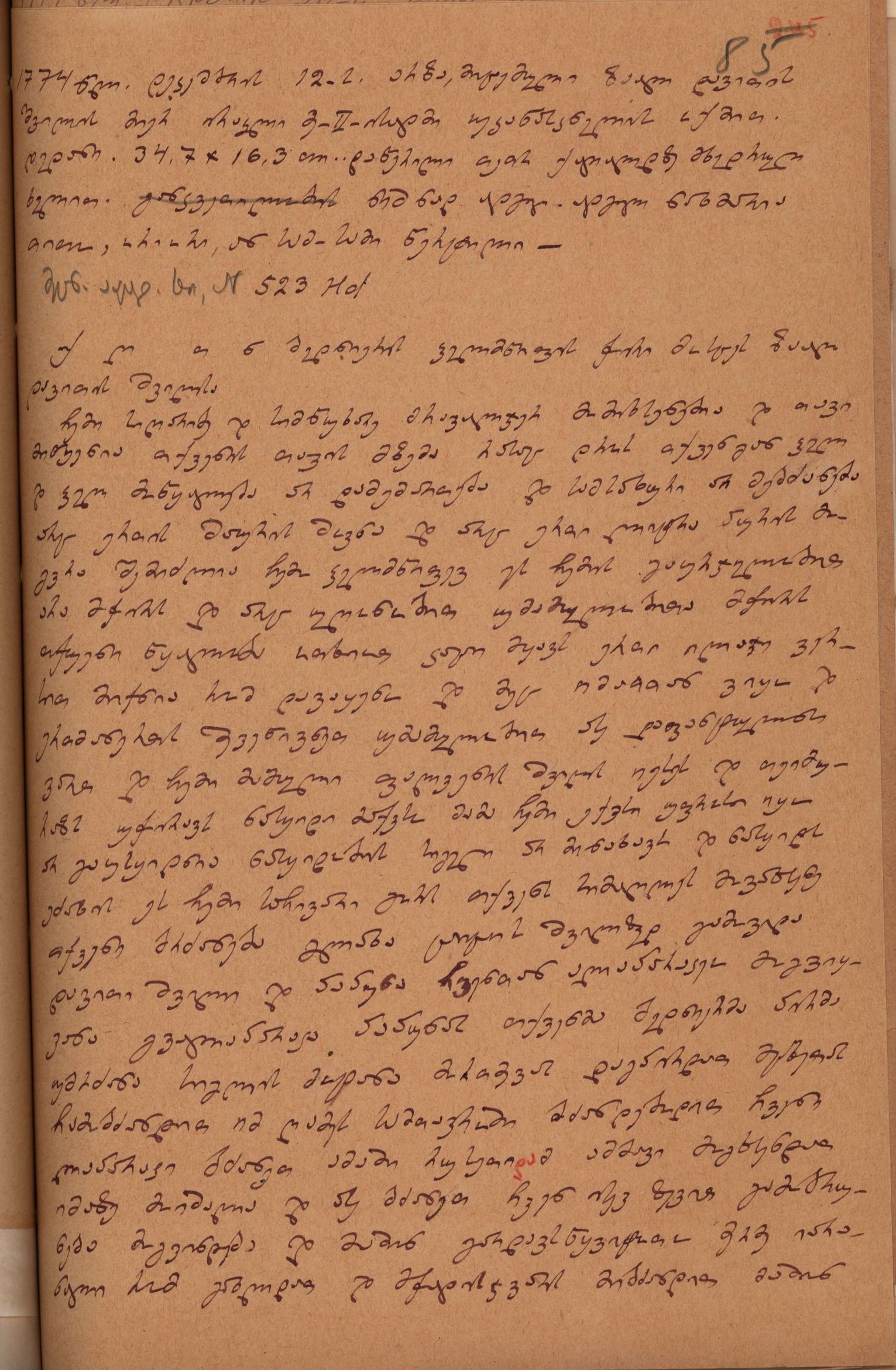 2. დედნის აღწერა გიორგი ბოჭორიძის მიერ: ,,დედანი, 34,7x16,3 cm.. დაწერილი თეთრ ქაღალდზე მხედრული ხელით. განკვეთილობის ნიშნად ადგილ-ადგილ ნახმარია თითო, ორ-ორი, ან სამ-სამი წერტილი". დედანი, ხეც, Hd 523,