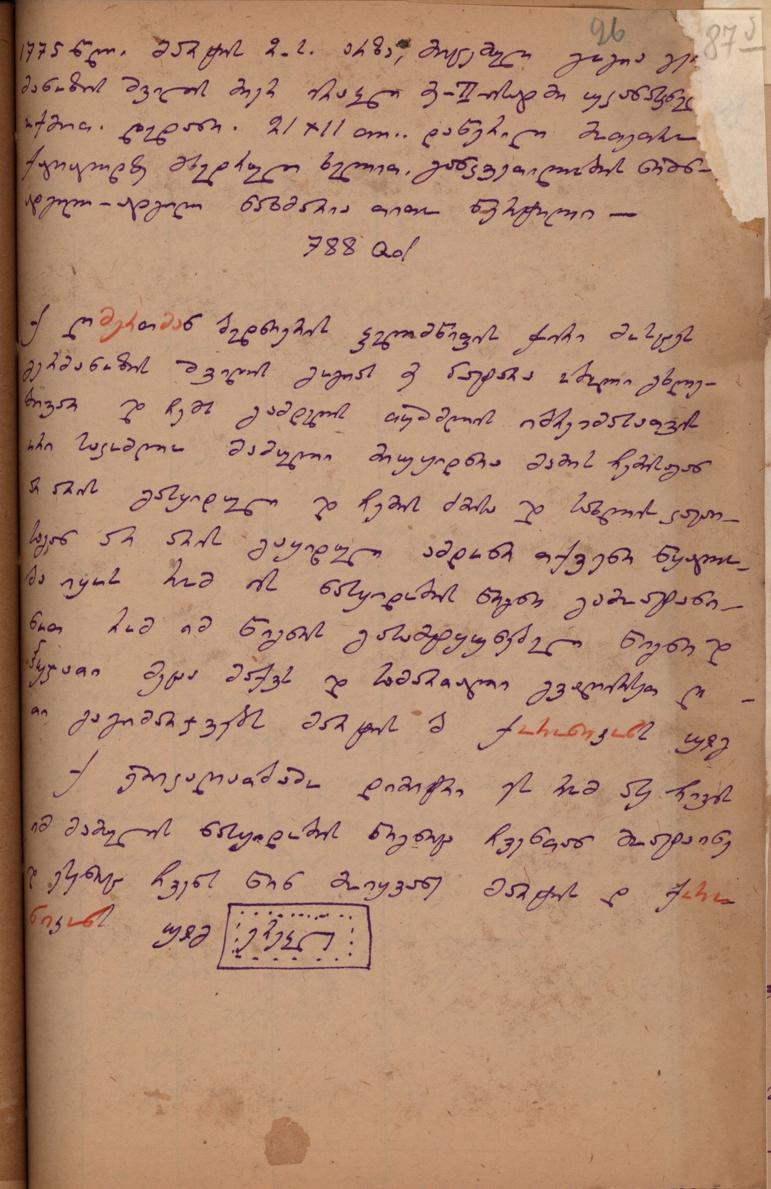 2. დედნის აღწერა გიორგი ბოჭორიძის მიერ: ,, დედანი, 21x11, cm.. დაწერილი მოთეთრო ქაღალდზე, მხედრული ხელით. განკვეთილობის ნიშნად ადგილ-ადგილ ნახმარია თითო წერტილი", ხეც, დედანი Qd 788; პირი Hd 8429.
