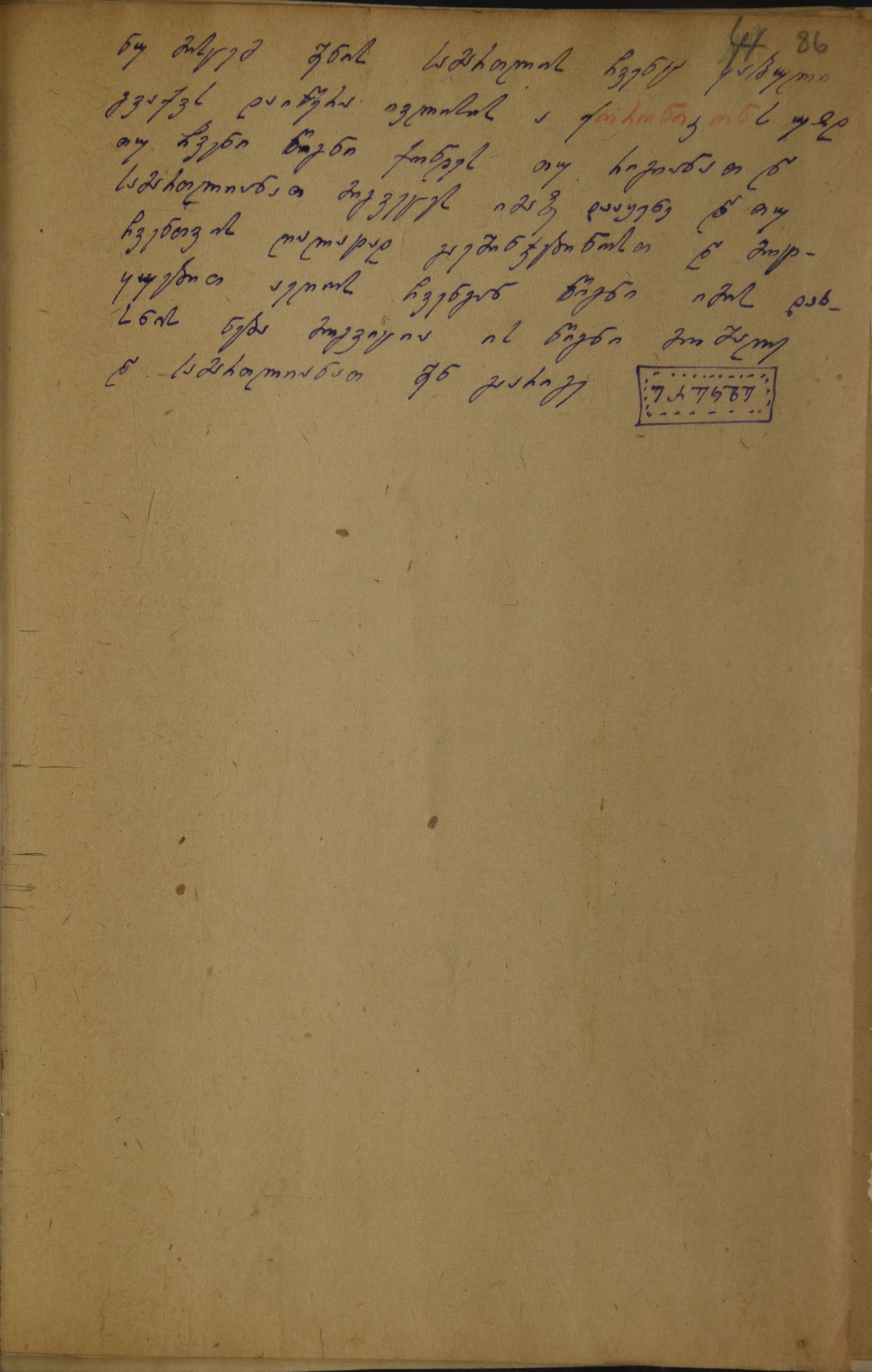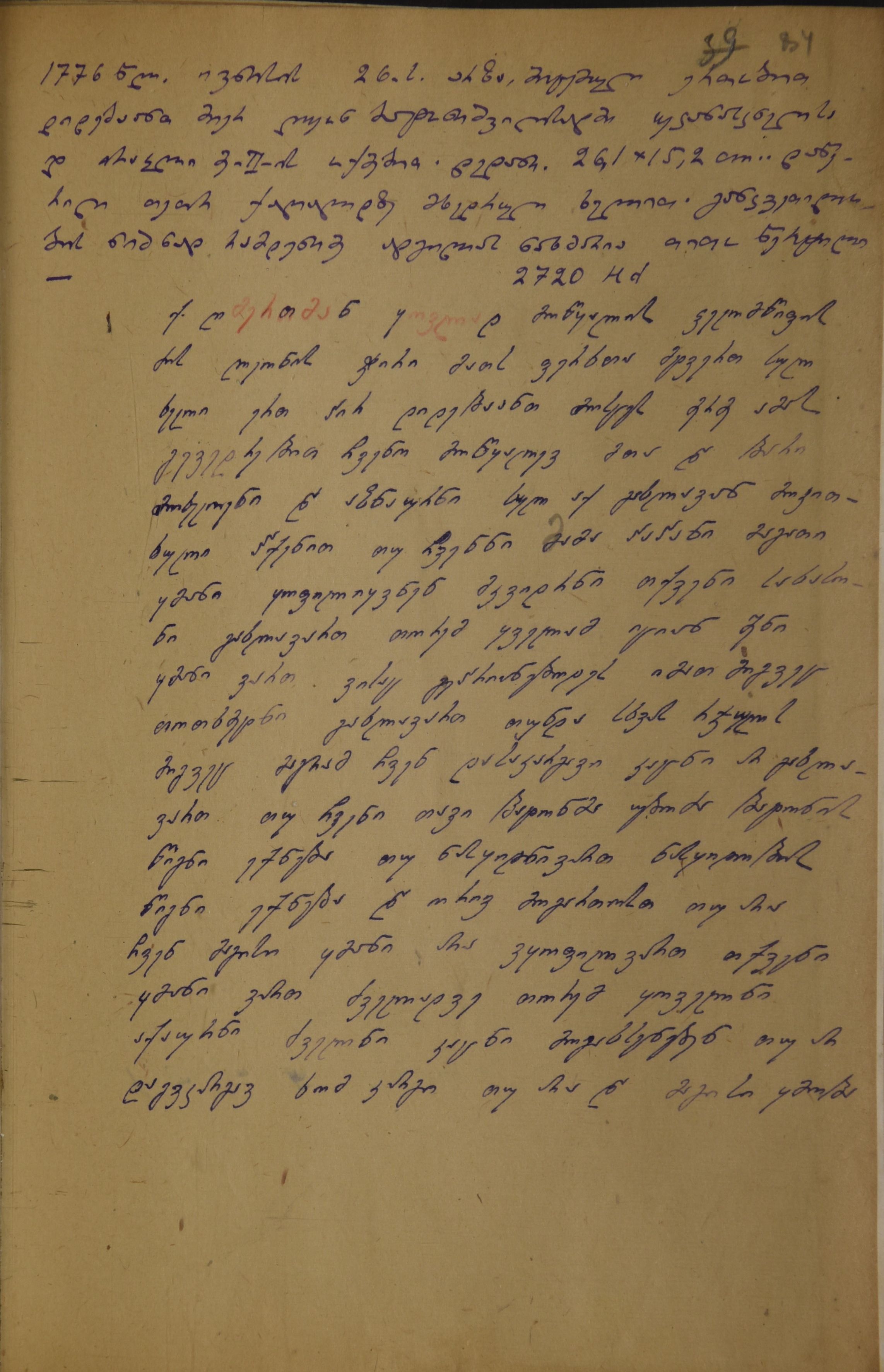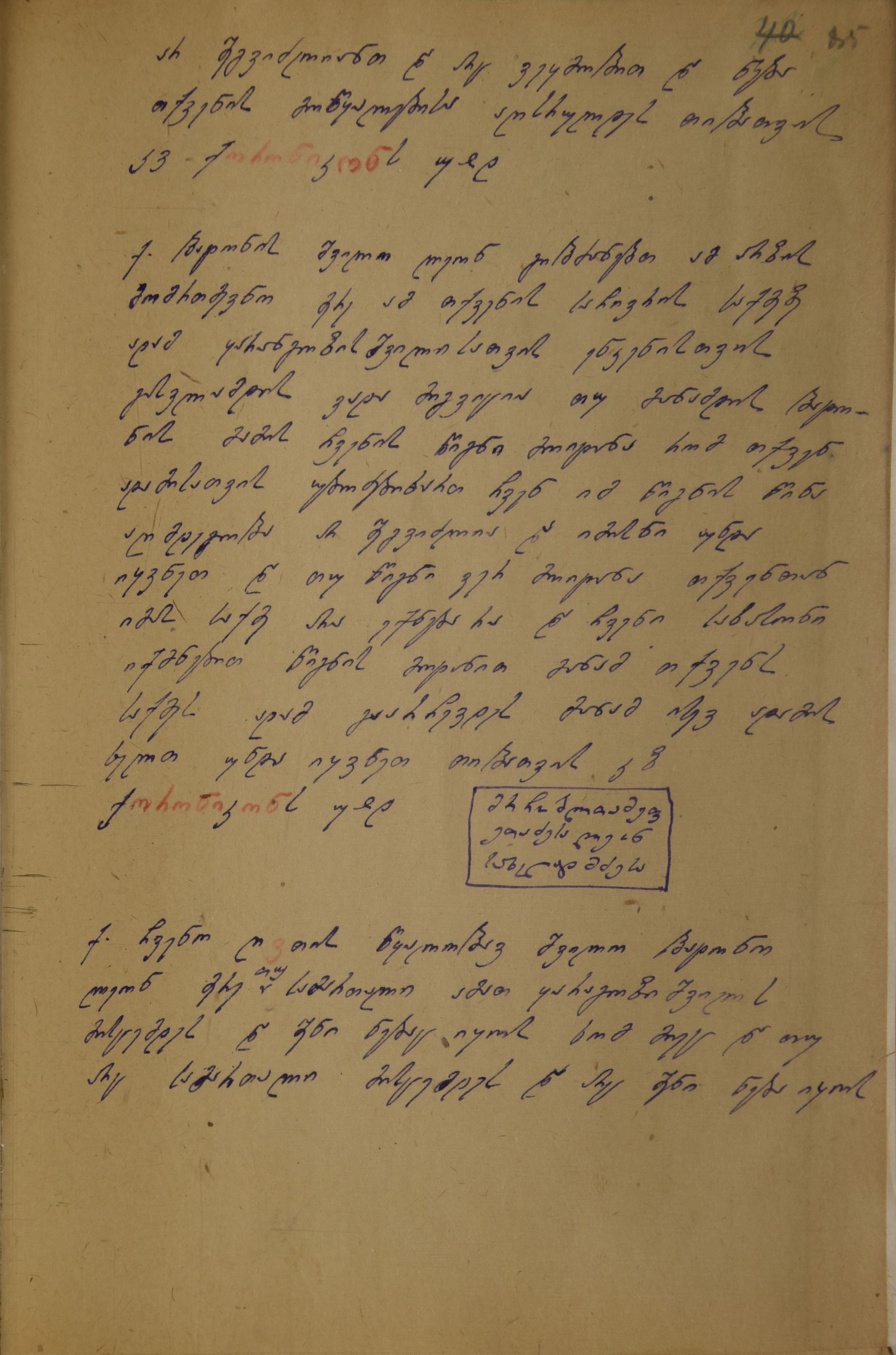 ქაღალდი მოყვითალო, დაწერილი ლურჯი მელნით და ადგილ-ადგილ წითელი ფანქრით