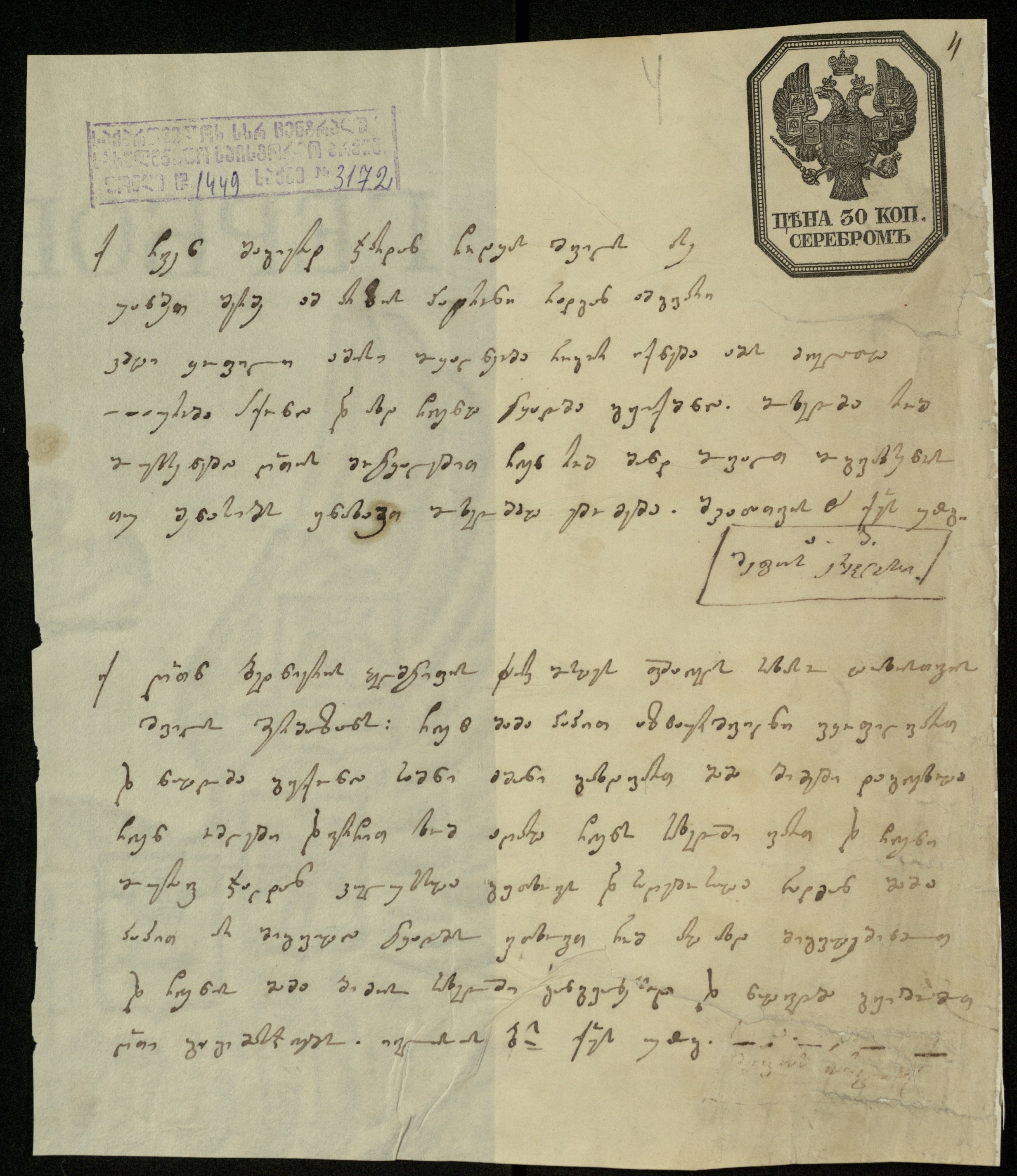 ჭვირნიშნიანი ქაღალდი მოყვითალო, დაწერილი ყავისფერი მელნით