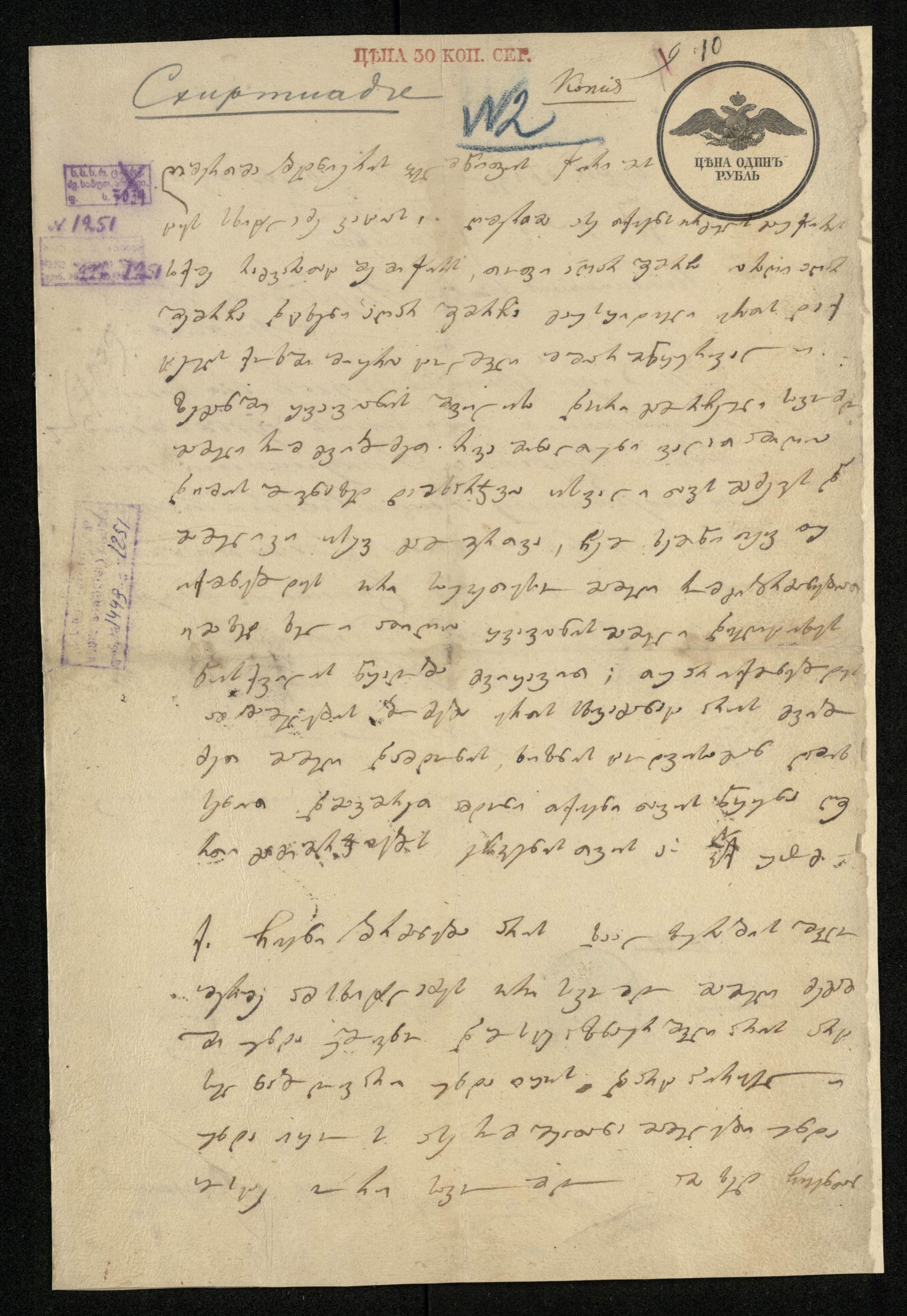 ჭვირნიშნიანი ქაღალდი მონაცრისფერი, დაწერილი შავი მელნით