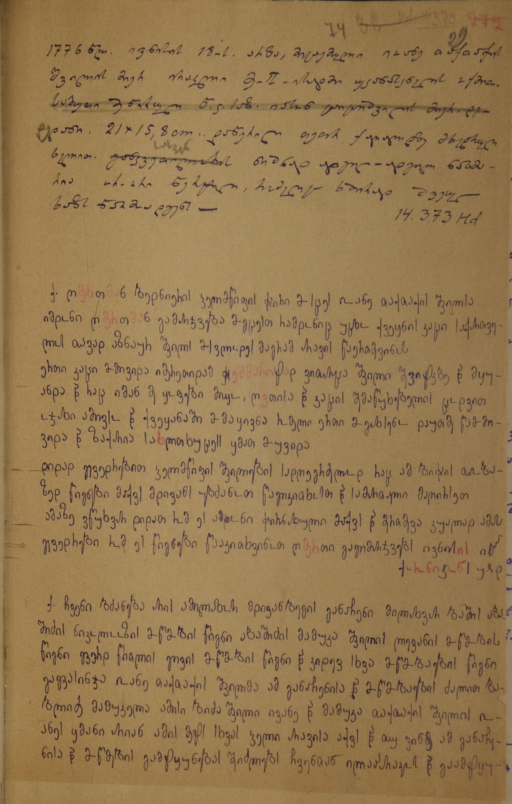 2. დედნის აღწერა გიორგი ბოჭორიძის მიერ: ..დედანი, 21x15,8, cm.. დაწერილი თეთრ ქაღალდზე მხედრული ხელით; სასვენ ნიშნადადგილ-ადგილ ნახმარია ორ-ორი წერტილი, რომელიც ხშირად შვეულ ხაზს წარმოადგენს", დედანი, ხეც, Hd 14373; პირი, ხეც, Ad 1509ა.