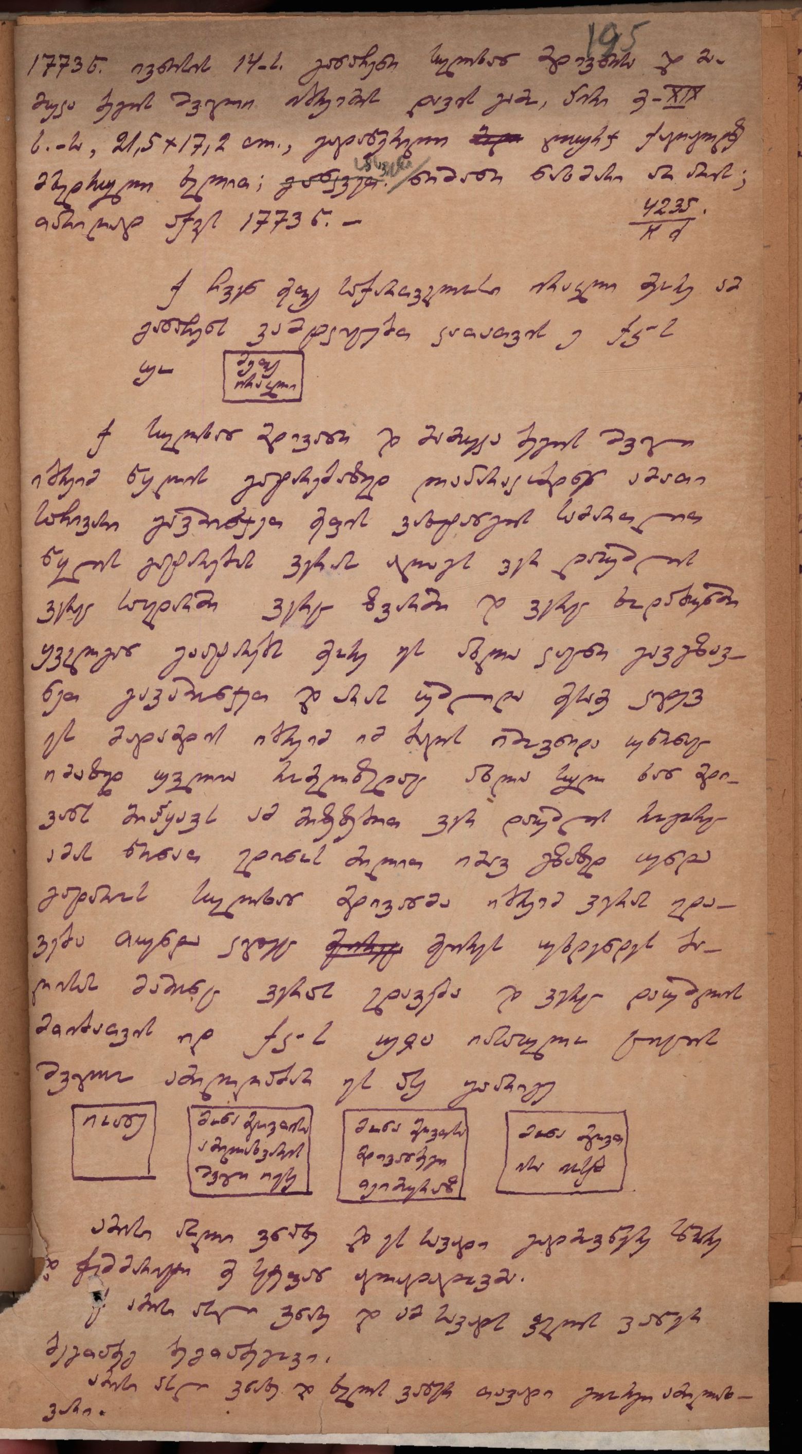 პირი აღწერა გიორგი ბოჭორიძის მიერ: ,,პირი, დაწერილი ლურჯ ქაღალდზე მხედრული ხელით. ზომა 21,5X17,2, განკვეთილობის ნიშანი ნახმარი არ არის", ხეც, Hd 4235.