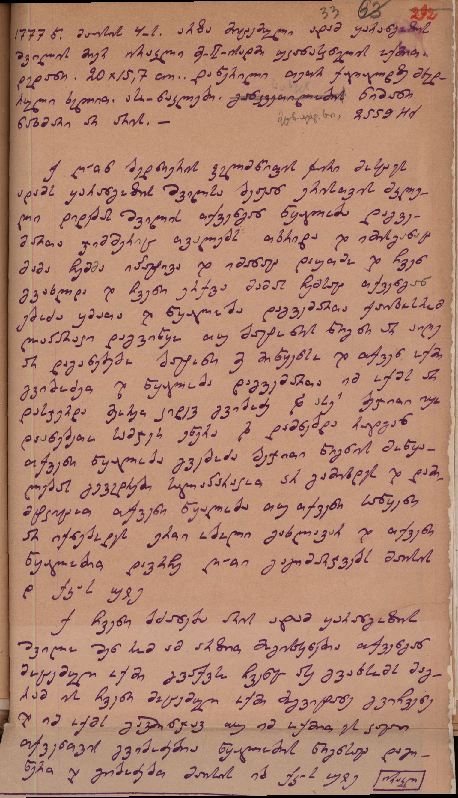 2. დედნის აღწერა გიორგი ბოჭორიძის მიერ: ,,დედანი, 20x15,7 cm.. დაწერილი თეთრ ქაღალდზრ მხედრული ხელით. ასო-ნაკლები, განკვეთილობის ნიშანი ნახმარი არ არის.
