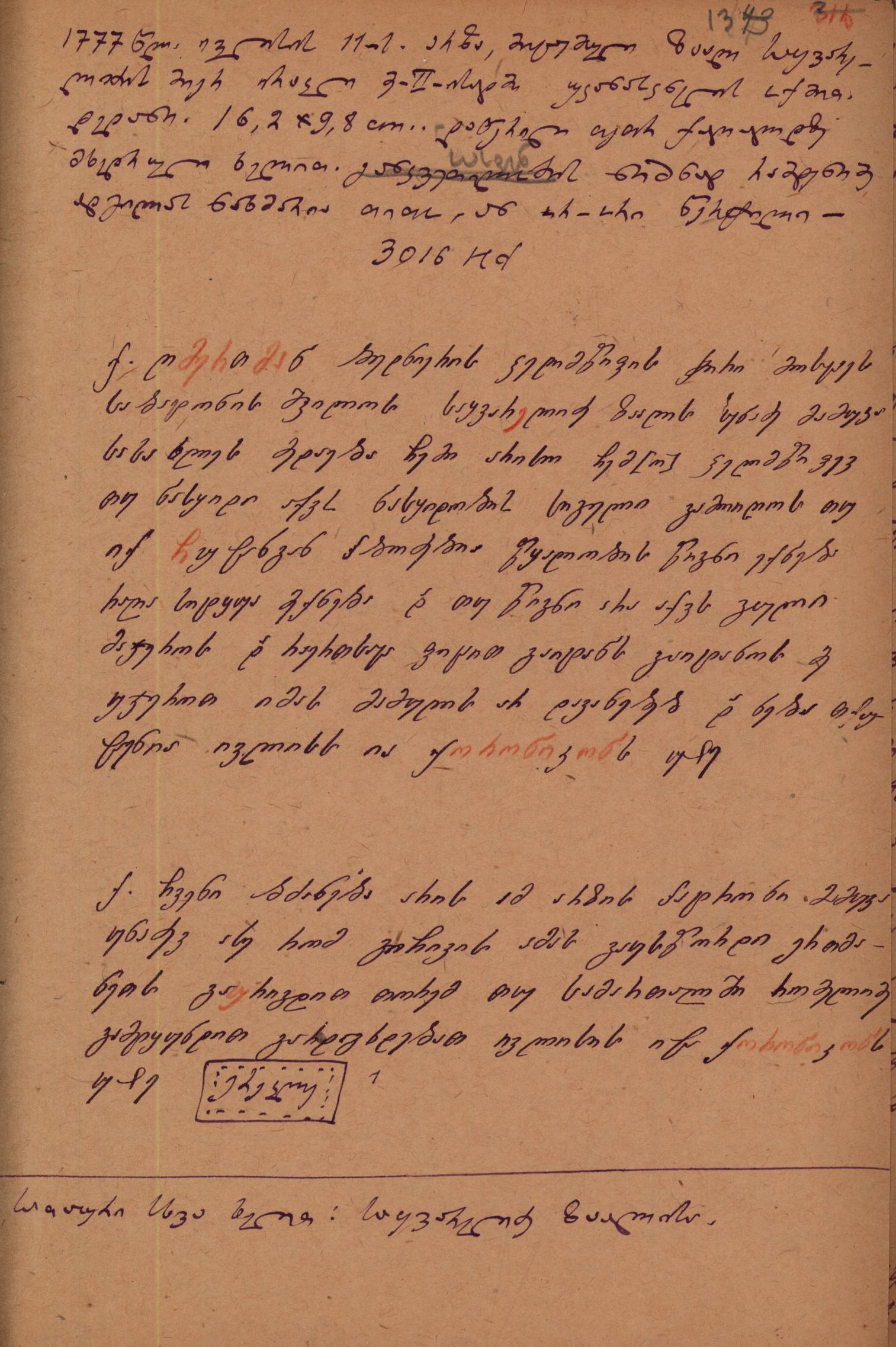 2. დედნის აღწერა გიორგი ბოჭორიძის მიერ: ,, დედანი, 16,2x9,8 cm..დაწერილი თეთრ ქაღალდზე მხედრული ხელით; სასვენ ნიშნად რამდენიმე ადგილას ნახმარია თიღო ან ორ-ორი წერტილი", ხეც, Hd 3016.