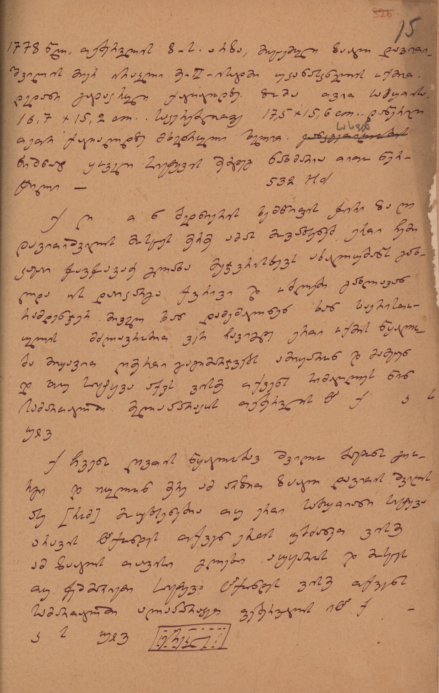2. დედნის აღწერა გიორგი ბოჭორიძის მიერ: ,,დედანი, გადაკრული ქაღალდზე ზომა თვით საბუთის 16,7X15,2 cm.. საკერებლითვე 17,5x15,6 cm.. დაწერილი თეთრ ქაღალდზე მხედრული ხელით, სასვენ ნიშნად ყოველი სიტყვის შემდეგ ნახმარია თითო წერტილი", დედანი, ხეც. Hd 532.