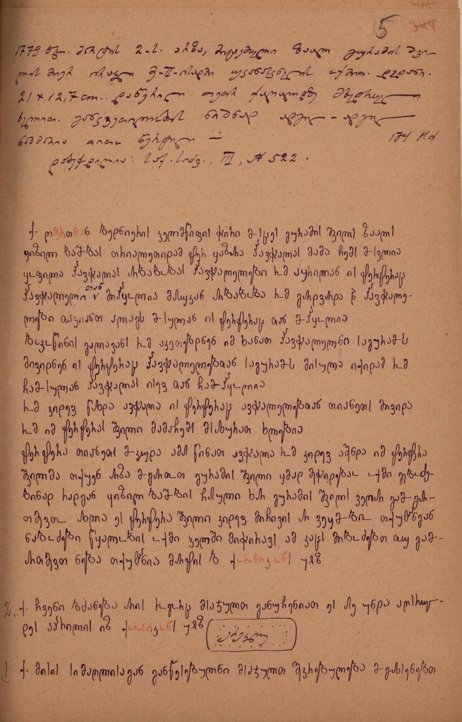 2. დედნის აღწერა გიორგი ბოჭორიძის მიერ: ,,დედანი, 21x12,7 cm.. დაწერილი თეთრ ქაღალდზე მხედრული ხელით; განკვეთილობის ნიშნად ადგილ-ადგილ ნახმარია თითო წერტილი\x.